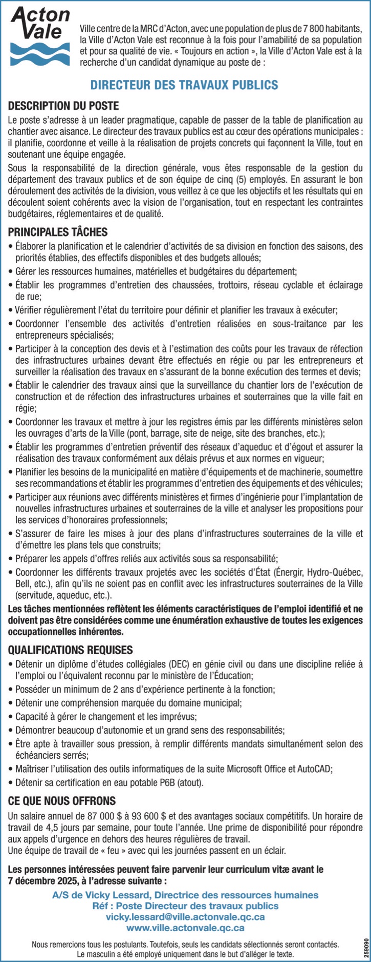 Ville centre de la MRC d’Acton, avec une population de plus de 7 800 habitants, la Ville d’Acton Vale est reconnue à la fois pour l’amabilité de sa population et pour sa qualité de vie.  « Toujours en action », la Ville d’Acton Vale est à la recherche d’un candidat dynamique au poste de :