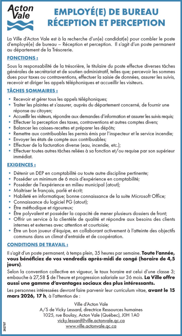 La Ville d’Acton Vale est à la recherche d’un(e) candidat(e) pour combler le poste d’employé(e) de bureau – Réception et perception.  Il s’agit d’un poste permanent au département de la Trésorerie.