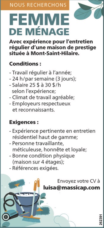 Avec expérience pour l’entretien régulier d’une maison de prestige située à Mont-Saint-Hilaire.
