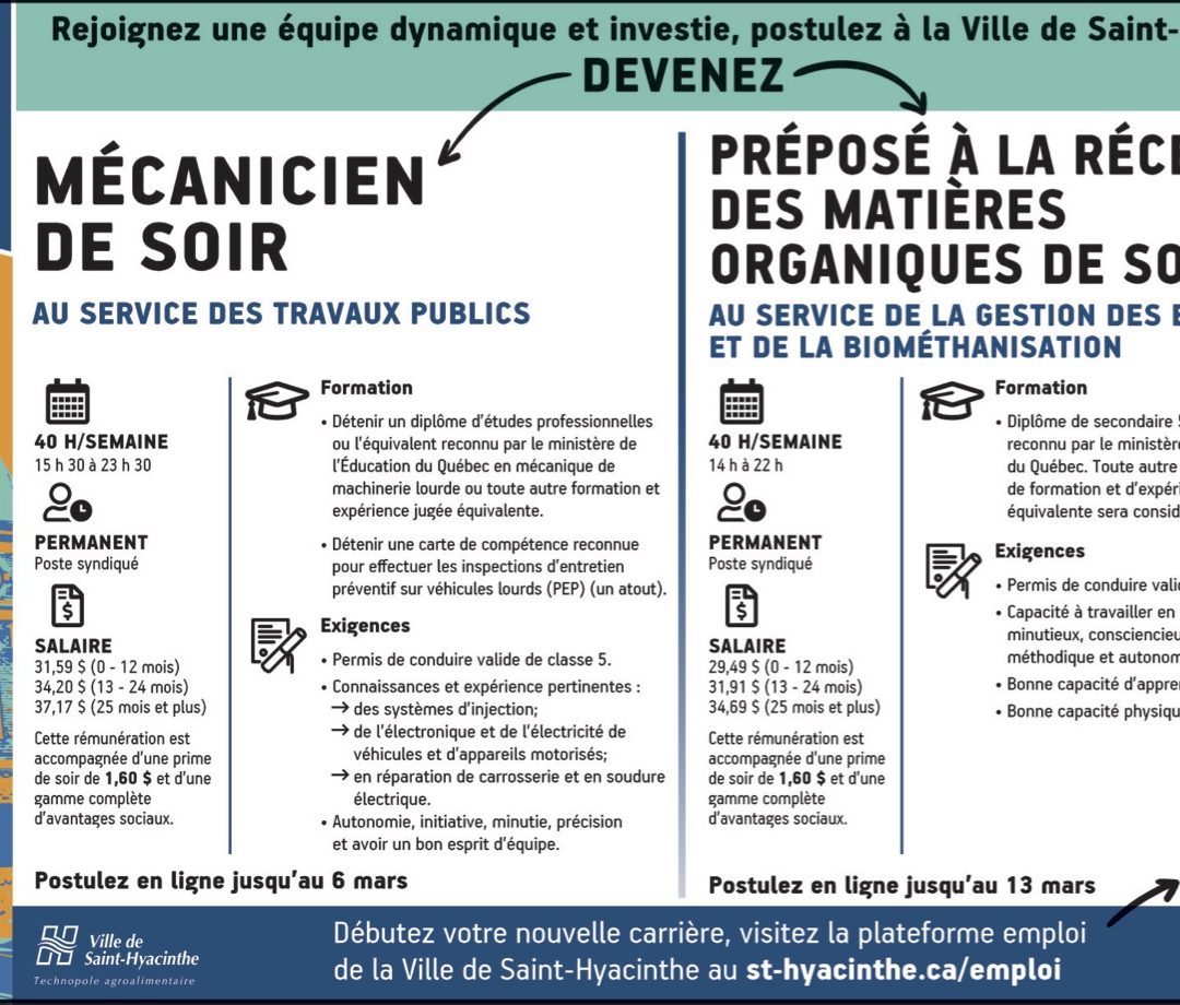 Débutez votre nouvelle carrière, visitez la plateforme emploi de la Ville de Saint-Hyacinthe au st-hyacinthe.ca/emploi