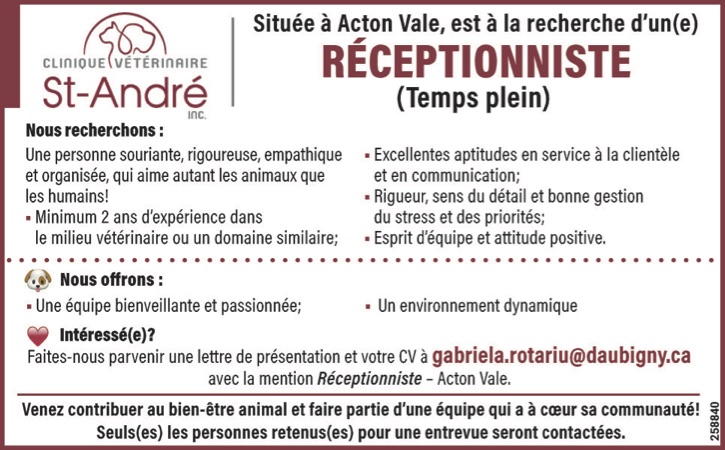 Faites-nous parvenir une lettre de présentation et votre CV à gabriela.rotariu@daubigny.ca avec la mention Réceptionniste – Acton Vale.